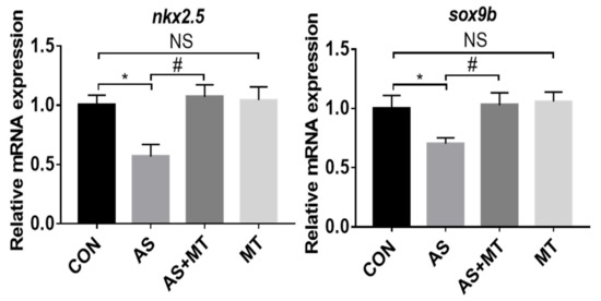 The effects of melatonin on the NaAsO2-induced relative mRNA expression levels of the genes essential for heart development in zebrafish embryos at 72 hpf. CON: system water as the vehicle control; AS: NaAsO2 at 1.0 mM; MT−9: Melatonin at 10−9 M. * p < 0.05, compared to CON; # p < 0.05, compared to MT; NS, compared to CON.