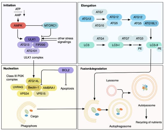 Functional mechanisms of autophagy. The most-studied form of autophagy is macroautophagy, a multistage and dynamic process. Autophagy is negatively regulated by the cell growth promoter rapamycin complex 1 (mTORC1), while the sensor of energy deprivation AMP-activated kinase (AMPK) activates autophagy. The canonical autophagy consists of four sequential stages: initiation, phagophore formation, phagophore elongation, and autophagosome–lysosome fusion [25]. During the initiation phase, the UNC-like autophagy-activating kinase 1 (ULK1) complex serves as a bridge between the upstream mTOR and AMPK and downstream autophagosome formation [26,27]. The complex is composed of ATG13, focal adhesion kinase-family-interacting protein of 200 kDa (FIP200), ATG101, and ULK1, in which ULK1 is the core protein with serine/threonine kinase activity [28]. After being stimulated by nutrient deficiency and stress-related pathways, phosphorylated ULK1 subsequently leads to membrane nucleation, which requires activation of class III phosphatidylinositol-3 kinase complex I (PI3KC3-CI). Formed by beclin-1, vacuolar protein sorting 34 (VPS34), autophagy-related protein 14- like protein (ATG14L), p150, and nuclear receptor-binding factor 2 (NRBF2), this multiprotein complex can be activated through ULK-dependent phosphorylation [29]. The nucleation of the isolation membrane, known as the phagophore, further expands with the support of PI3KC3-CI [30]. At the phagophore assembly site, the complex produces PI3P, favoring the recruitment of the effector proteins (such as WIPI/II), thus resulting in the phagophore elongation [31]. This phase is further promoted by the ubiquitin-like conjugation system, involving the E1 ligase, ATG7, the E2 ligase, ATG3, and the E3 ligase complex, ATG12/ATG5/ATG16L [32]. Through ATG4-dependent proteolytic cleavage, followed by the action of the conjugation system, microtubule-associated proteins 1A/1B light chain 3 (LC3) can be transformed to lipidated LC3 (LC3-II), which is instrumental for elongation and closure of the phagophore [33]. Meanwhile, LC3-II physically links to substrates that contain the LC3-interacting region (LIR) motif, thereby targeting them for degradation. Once phagophores are closed, the ensuing autophagosomes fuse with lysosomes to form autolysosomes; within them, the delivered contents are degraded and recycled [34].