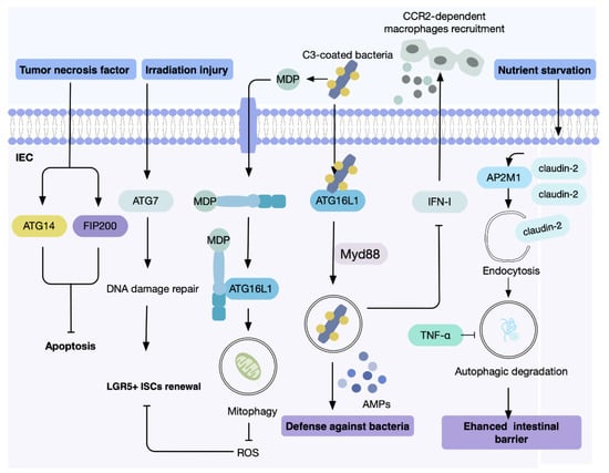 The proposed mechanisms by which autophagy modulates the balance of bacterial flora include direct degradation of harmful bacteria and regulation of the antibacterial immune response. Under physiological conditions, all intestinal bacteria are coated with complement protein C3 [44]. Following the invasion of potentially pathogenic microorganisms into the intestinal mucosa, C3 on the bacterial surfaces can be targeted by host cytosol ATG16L1, thereby activating the autophagy system [45]. Apart from this, it has been reported that MyD88, the canonical adaptor for inflammatory signaling pathways, was also required during the process of autophagy induction [46]. It is worth mentioning that autophagy in IECs can affect the expression and secretion of antimicrobial peptides (AMPs) to restrict bacterial dissemination [47]. Interestingly, several mouse models in which different autophagy genes are deleted in IECs (including ATG16L1, ATG4B and LC3B) showed an enhanced response to microbiota-induced type I interferon (IFN-I) signaling [48]. This spontaneous activation of IFN-I in IECs conferred protection against the pathogen Citrobacter rodentium and chemical injury via C-C motif chemokine receptor 2 (CCR2)-dependent monocyte recruitment, fortifying the intestinal barrier in response to both infectious and non-infectious stress [48]. Although autophagy was demonstrated to have an adverse function in antimicrobial activity and tissue repair, as evidenced by this study, the immunomodulatory properties of IFN-I signaling may be far more nuanced under different circumstances, such as autoimmune diseases and tumor immunity [48,49].