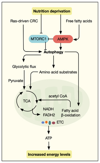 The crosstalk between autophagy and metabolic reprogramming CRC cells is highly proliferative and metabolically active, requiring large amounts of energy and metabolic precursors. In this context, autophagy serves as an alternative source of nearly all aspects of metabolic fuel. By coordinating glycolysis, fatty acid β-oxidation, and tricarboxylic acid cycle, autophagy is intimately connected to the metabolic reprogramming of CRC.