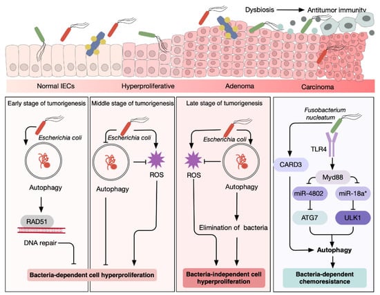 Another mucosa-associated bacterium, Escherichia coli, is likely to exert an oncogenic phenotype in CRC through crosstalk with autophagy in a time-dependent manner. Activated autophagy can protect against CRC initiation in response to bacterial-induced stress. During the early stage of CRC initiation, increased epithelial autophagy eliminated the intracellular Colibactin-producing Escherichia coli to ameliorate malignant transformation in ApcMin/+ mice [75]. Colibactin-producing E coli (CoPEC), a colonic mucosa-associated E coli frequently detected in CRC patients, are able to promote CRC development by inducing genomic instability and inflammation [93,102,103]. There was evidence that autophagy-mediated elimination of Colibactin-producing Escherichia coli (CoPEC) limited the carcinogenesis process in ApcMin/+ mice by stimulating bacteria-induced DNA damage repair via RAD51 and reducing the secretion of inflammatory cytokines IL 6 and IL 8 [75]. Following this, at the mid phase of CRC development, the invasive E. coli that successfully colonized the colonic epithelium blocked autophagy to avoid clearance, achieving persistent infection. The repression of autophagy by E. coli, in turn, led to increased generation of ROS and epithelial hyperproliferation. However, as the dysplasia tissue progressed, autophagy was upregulated to eradicate the pathogen, suggesting an E. coli -independent tumor growth in the late stage of CRC development [104]. In line with this, the only time window when antibiotic intervention exhibited a tumor-suppressive effect was in the middle stages of tumor development [104]. Hence, the interplay between gut microbes and autophagy changes over time in the course of CRC development and therefore awaits future studies (Figure 5).