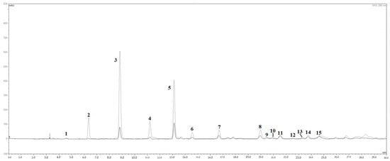 The HPLC/DAD chromatograms of mango leaf extracts, visualized at 280 nm, are shown in Figure 1. Fifteen peaks were tentatively recognized on the basis of their relative retention times, UV/Vis and mass spectral data, injection with pure analytical standards, and comparison with literature data. In the chromatogram of red mango leaves, polyphenols were the most represented class of metabolites, particularly the subclass of benzophenone/xanthone derivatives []. In fact, six peaks over 15 (peaks 2, 3, 4, 6, 7, and 8) corresponded to maclurin and iriflophenone derivatives, while mangiferin, the peculiar xanthone of this species, was present with one metabolite only (peak 5). Peaks 1, 11, 14, and 15 corresponded to gallic acid (peak 1) and its derivatives with a hexose, plausibly glucose. Flavonols, mainly quercetin derivatives (peaks 9, 10, 12, and 13), were the only subclass of flavonoids found in the extract. Iriflophenone 3-C-glucoside (peak 3 in Figure 1) was by far the main compound with 4.218 mg/mL in the extract coming from red leaves, followed by mangiferin (peak 5 in Figure 1; 2.023 mg/mL in red leaf extract; see also Table 2). Red mango leaves are rich in polyphenols, plausibly due to a higher accumulation of defense metabolites in the earlier stage of leaf development []. Interestingly, in the case of mango leaves, overaccumulation seemed to affect almost exclusively the subclass of benzophenone/xanthone metabolites, whilst the other subclasses did not undergo remarkable changes (Table 2). Our data showed an exclusive high concentration of iriflophenone 3-C-glucoside and mangiferin contained in the leaves (Figure 1).