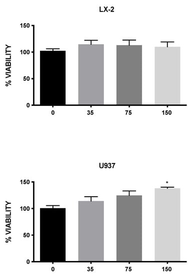 The viability assay of LX-2 and U937 cells according to bromide 3-(4,5-dimethylthiazol-2-yl)-2,5-diphenyltetrazolium (MTT) assay after treatment for 24 h with 0, 35, 75, and 150 μg/mL of MLE. Bars represent the mean ± SEM. * p < 0.5 versus control (CTRL).