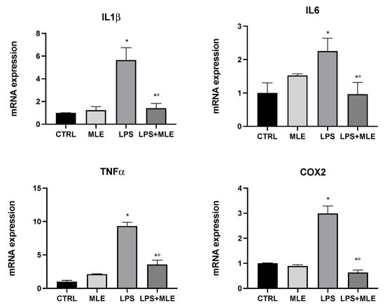 Our data showed a higher antioxidant and antibacterial profile of the leaf extract; therefore, its possible bioactive effect on in vitro models of inflammation was subsequently analyzed. U937 cells, differentiated into macrophages, were used as an in vitro model to evaluate the anti-inflammatory activity of MLE. Differentiated macrophages were treated with lipopolysaccharide (LPS), and, after 2 h, the MLE was added at 35 μg/mL for 4 h. The expression of proinflammatory genes such as cyclooxygenase-2 (COX-2) (involved in the production of prostaglandins) [], interleukin-6 (IL6), interleukin-1β (IL-1β), and tumor necrosis factor-α (TNF-α) was evaluated. Figure 4 shows that, in macrophages treated with LPS, there was an increase in proinflammatory genes compared to the control group. The cotreatment with MLE reversed these harmful outcomes by downregulating inflammatory gene expression to values close to the control (untreated macrophages).