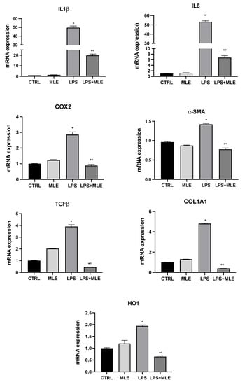 The LX-2 cell line was used as an in vitro model to evaluate the eventually hepatic anti-inflammatory and antifibrotic activity of MLE. In LX-2 cells treated with LPS, the expression of proinflammatory cytokines genes, IL-1β, IL-6, and COX-2 was evaluated. Figure 5 shows that, in human stellate cells treated with LPS, there was an increase in proinflammatory genes compared to the control group. The cotreatment with MLE reversed the previous trend, downregulating gene expression levels. Furthermore, the expression of fibrotic markers alpha smooth muscle actin (α-SMA), transforming growth factor beta (TGFβ), and collagen type I alpha 1 (COL1A1) was evaluated. LPS treatment strongly induced the expression of fibrotic genes, whereas MLE was able to reduce gene expression levels close to control group values. Lastly, we investigated heme oxygenase 1 (HO1) gene expression, a cellular oxidative stress marker [,]. We found an increase in HO1 expression following LPS treatment, while cotreatment with MLE was able to counteract this effect.