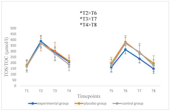 The level of TOS/TOC index in all of the tested groups during the 1st (T1–T4) and 2nd (T5–T8) series of testing. Blood sampling: T1 = 1 h before eccentric test in the 1st series; T2 = 1 h; T3 = 24 h; T4 = 48 h following the eccentric test in the 1st series (beginning of 5-week supplementation period in the experimental and placebo groups); T5 = 1 h before the eccentric test in the 2nd series; T6 = 1 h; T7 = 24 h; T8 = 48 h after the eccentric test in the 2nd series of testing (end of supplementation). Data are presented as mean values ± standard deviation. Significant differences (p < 0.05) were indicated at respective time-points for the experimental (*), placebo (#) and control groups (+).