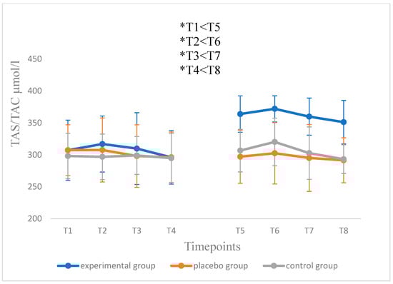 No significant differences in the mean plasma antioxidant potential (TAS/TAC) were observed between the 1st and 2nd series during any of the measurements in the control (p = 0.297) or placebo groups (p = 0.670). In turn, before the beginning of the test with the predominance of eccentric contractions, this potential was at the level of 307.2 ± 47.1 μmol·L−1 in the experimental group during the 1st series of tests, and in the second series, 363.9 ± 28.5 μmol·L−1, which allowed to indicate that supplementation with the hydrolysate-added snack allowed to increase the antioxidant potential from medium to high. A similar trend was observed in subsequent measurements, and the differences in the mean plasma antioxidant potential between the 1st and 2nd series were of statistical significance (p < 0.001) (Figure 2).