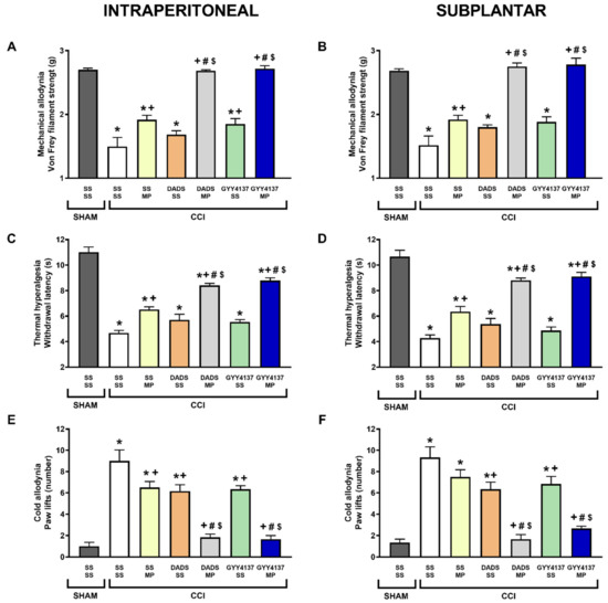 Effects of the co-administration of DADS or GYY4137 with morphine on the mechanical allodynia, thermal hyperalgesia, and cold allodynia induced by nerve injury in mice. Effects are represented of the i.p. administration of 3.5 mg/kg of DADS or 0.7 mg/kg of GYY4137 combined with 3 mg/kg or 65 µg of morphine (MP), intraperitoneally or subplantarly injected, on the mechanical allodynia (A,B), thermal hyperalgesia (C,D), and cold allodynia (E,F) provoked by sciatic nerve injury (CCI) in the ipsilateral paws. The effects of these treatments administered alone are also represented. Sham-operated (SHAM) animals treated with SS plus SS are also represented. For each test, * represents significant differences vs. SHAM-animals treated with SS plus SS, + vs. CCI-mice treated with SS plus SS, # vs. CCI-mice treated with SS plus MP and $ vs. CCI-mice treated with DADS or GYY4137 plus SS (p < 0.05; one-way ANOVA, followed by Tukey test). Each column represents the mean, and vertical bars indicate SEM (n = 6 animals for treatment).