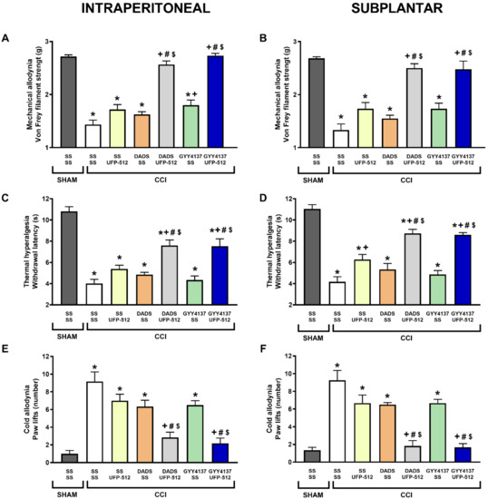 Effects of the co-administration of DADS or GYY4137 with UFP-512 on the mechanical allodynia, thermal hyperalgesia, and cold allodynia induced by nerve injury in mice. Effects are represented of the i.p. injection of DADS (3.5 mg/kg) or GYY4137 (0.7 mg/kg) co-administered with 1 mg/kg or 12.5 µg of UFP-512, intraperitoneally or subplantarly injected, on the mechanical allodynia (A,B), thermal hyperalgesia (C,D), and cold allodynia (E,F) provoked by sciatic nerve injury (CCI) in the ipsilateral paws. The effects of these treatments administered alone are also represented. Sham-operated (SHAM) animals treated with SS plus SS are also represented. For each test, * represents significant differences vs. SHAM-animals treated with SS plus SS, + vs. CCI-mice treated with SS plus SS, # vs. CCI-mice treated with SS plus UFP-512 and $ vs. CCI-mice treated with DADS or GYY4137 plus SS (p < 0.05; one-way ANOVA, followed by Tukey test). Each column represents the mean, and vertical bars indicate SEM (n = 6 animals for treatment).