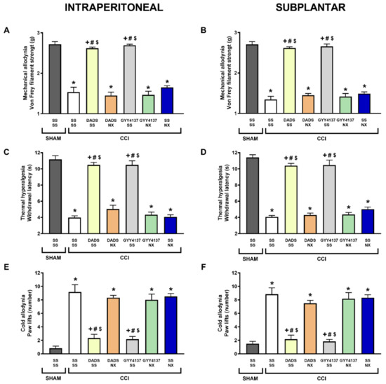 Reversal of the antiallodynic and antihyperalgesic effects of DADS and GYY4137 by naloxone during neuropathic pain. The inhibitory actions produced by i.p. injection of DADS (30 mg/kg) or GYY4137 (24 mg/kg) alone, and combined with naloxone (NX) intraperitoneally (3 mg/kg) (A,C,E) or subplantarly injected (20 µg) (B,D,F) in mice with CCI-provoked neuropathic pain, are represented. Sham-operated (SHAM) animals treated with SS plus SS are also represented. For each test, * represents significant differences vs. SHAM-animals treated with SS plus SS, + vs. CCI-mice treated with SS plus SS, # vs. CCI-mice treated with DADS or GYY4137 plus NX, and $ vs. CCI-mice treated with SS plus NX (p < 0.05; one-way ANOVA, followed by Tukey test). Each column represents the mean, and vertical bars indicate SEM (n = 6 animals for treatment).