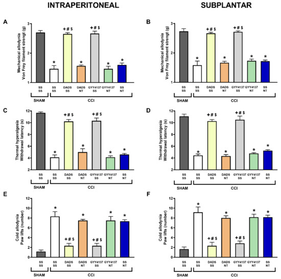 Reversal of the antiallodynic and antihyperalgesic effects of DADS and GYY4137 by naltrindole during neuropathic pain. The inhibitory actions induced by the i.p. injection of DADS (30 mg/kg) or GYY4137 (24 mg/kg) alone, and combined with naltrindole (NT) intraperitoneally (3 mg/kg) (A,C,E) or subplantarly injected (50 µg) (B,D,F) in mice with CCI-provoked neuropathic pain, are represented. Sham-operated (SHAM) animals treated with SS plus SS are also represented. For each test, * represents significant differences vs. SHAM-animals treated with SS plus SS, + vs. CCI-mice treated with SS plus SS, # vs. CCI-mice treated with DADS or GYY4137 plus NT, and $ vs. CCI-mice treated with SS plus NT (p < 0.05; one-way ANOVA, followed by Tukey test). Each column represents the mean, and vertical bars indicate SEM (n = 6 animals for treatment).