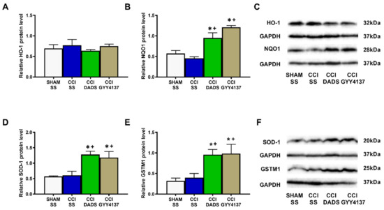 Finally, nerve-injured mice injected with DADS or GYY4137 were euthanized by cervical dislocation, and the HO-1, NQO1, SOD-1, GSTM1, 4-HNE, BAX, MOR, and DOR protein levels in the MS and DRG were assessed by Western blot. Sham-operated animals injected with SS were utilized as controls (n = 3 samples).