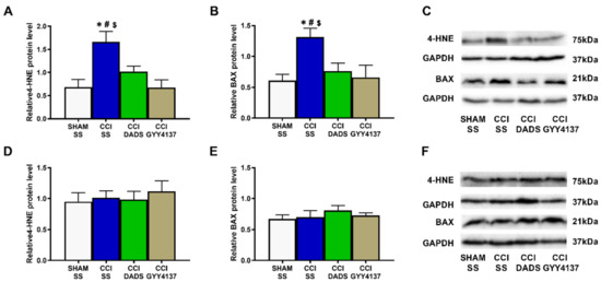 The influence of DADS and GYY4137 treatments on the expression of 4-HNE and BAX in the MS and DRG of mice with neuropathic pain. In the MS, both treatments regularized the overexpression of 4-HNE (A) and BAX (B). No changes in the expression of 4-HNE (D) or BAX (E) were detected in the DRG. Sham-operated (SHAM) mice treated with SS were used as control groups. 4-HNE and BAX are expressed relative to GAPDH levels. Blots for 4-HNE and BAX in the MS (C) and DRG (F) are presented. In all pictures, * symbolizes significant changes vs. SHAM-animals treated with SS; # vs. CCI-mice injected with DADS; and $ vs. CCI-mice injected with GYY4137 (p < 0.05; one-way ANOVA followed by Tukey test). Each column represents the mean, and vertical bars indicate SEM (n = 3 samples).
