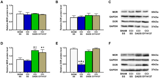 The influence of DADS and GYY4137 treatments on the expression of MOR and DOR in the MS and DRG of mice with neuropathic pain. Both treatments did not alter the protein levels of MOR (A) and DOR (B) in the MS, increased the expression of MOR (D), and avoided the down-regulation of DOR (E) in the DRG. Sham-operated (SHAM) mice treated with SS were used as control groups. MOR and DOR levels are expressed in relation to GAPDH. Blots for MOR and DOR in the MS (C) and DRG (F) are presented. In all pictures, * denotes significant changes vs. SHAM-animals injected with SS; + vs. CCI-mice injected with SS; # vs. CCI-mice injected with DADS; and $ vs. CCI-mice injected with GYY4137 (p < 0.05; one-way ANOVA followed by Tukey test). Each column represents the mean, and vertical bars indicate SEM (n = 3 samples).