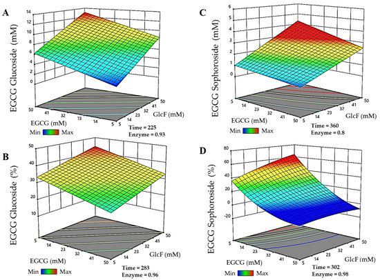 The results of productions and conversions obtained in these reactions were used to generate a polynomial quadratic model for each EGCG glycoside, whose equations can be found in the Supplementary Materials (Supplementary Data S1). The analysis of the variance test performed by the software validated the experimental setups.