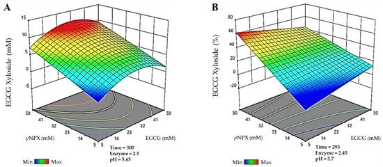 Finally, for the EGCG-xyloside, the maximum production detected (Figure 3A) was 11.9 mM, and it was obtained in a 300 min reaction, using 31.7 mM EGCG as acceptor, 49.8 mM pNPX as donor, 2.5 g/L BxTW1-E495A, and 5.65 pH. The maximum conversion of EGCG for the synthesis of this molecule (Figure 3B) was 61.7%, in a reaction of 293 min, with 5.7 mM EGCG, 50 mM pNPX, 2.45 g/L BxTW1-E495A, and 5.7 pH.