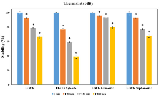 Thermal stability measured as relative degradation of EGCG and its glycosylated derivatives. In the study, 500 µM solutions of each molecule were incubated for 3 h at 70 °C. Student’s t-test: * p < 0.05 with respect to the 0 min measurement.