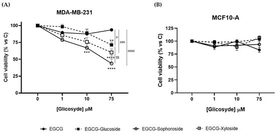 Effect of EGCG and its glycosides on the viability of (A) MDA-MB-231 and (B) MCF-10A cells after 24 h of compound addition. Cell viability was determined by crystal violet assay. Data represent mean ± SEM of three independent experiments. * p < 0.05, ** p < 0.01, *** p < 0.005, **** p < 0.001 vs. vehicle-treated cells. # p < 0.05, ### p < 0.005, #### p < 0.001 vs. 75 μM EGCG-treated cells. $$ p < 0.01 vs. 75 μM EGCG-Glucoside-treated cells.