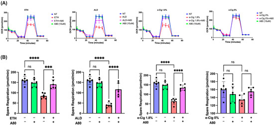 Mitochondrial OXPHOS levels diminished by ETH, ALD or 1.8% e-Cig exposure were restored by P2X7r antagonist. Mitochondrial SRC levels were measured after overnight exposure to ETH, ALD, and 1.8% e-Cig conditioned media. (A) shows the mito-stress graphs against ETH, ALD, and e-Cig (1.8%, 0% nicotine) stimulation. We quantified mitochondrial spare respiration (SRC) by subtracting basal respiration from the maximal respiration. (B) After overnight incubation, we recorded a 50% reduction in spare respiration against ETH exposure, 75% reduction against ALD, and 60% decrease after treatment with1.8% e-Cig containing media. Although SRC levels in cells treated with 0% e-Cig stimulus show a similar pattern, changes in SRC levels were not significant. Cells treated with P2X7r antagonist A804598 restored the SRC levels against ETH, ALD, and 1.8% e-Cig stimuli (n = 6). We normalized the Seahorse data to untreated control cells and One-Way ANOVA was used for statistical analysis, marked as *** p ≤ 0.001, **** p ≤ 0.0001 and ns (not significant).