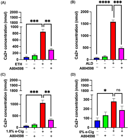 By blocking P2X7r and TRPV1 channels, A804598 inhibited the intracellular Ca2+ influx enhanced by ETH, ALD, or 1.8% e-Cig. hBMVECs exposed to (A) ETH, (B) ALD, and (C) 1.8% e-Cig showed one thousand-to-fifteen-hundred-fold increase in intracellular Ca2+ levels and cells treated with A804598 significantly diminished the intracellular Ca2+ levels. (D) e-Cig with 0% nicotine showed no impact on intracellular Ca2+ levels (n = 3). One-way ANOVA was used for the statistical analyses as * p ≤ 0.05, ** p ≤ 0.01, *** p ≤ 0.001, **** p ≤ 0.0001 and ns (not significant).