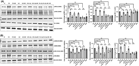 P2X7r antagonist (A804598) reduced the non-canonical ER stress induced by ETH, ALD, and e-Cig stimulation in hBMVECs. (A) ER Ca2+ buildup induced by ETH, ALD, and 1.8% e-Cig stimulus increased the expression pro-apoptotic p-IRE1α by three-fold and p-ASK1 by two-fold, respectively, and reduced the anti-apoptotic BAX inhibitor-1 (BI-1) protein expression by fifty percent (50%). (B) ER stress due to Ca2+ accumulation also significantly reduced the expression of p- GSK3β S9 and p-ERK1/2 and instigated p-P38 MAPK levels. hBMVECs treated with A804598 (A80) could prevent the ER stress induced apoptotic signals. Western blot data were normalized to β-actin/total GSK3β (n = 3). One-way ANOVA was used for the statistical analyses, marked as * p ≤ 0.05, ** p ≤ 0.01, *** p ≤ 0.001, **** p ≤ 0.0001 and ns (not significant).