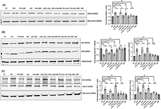 P2X7r antagonist (A804598) protected the mitochondrial function against ETH, ALD, and 1.8% e-Cig stimuli. (A) ETH stimulation increased the VDAC levels by fifty percent (50%), whereas ALD and 1.8% e-Cig stimulus doubled the VDAC expression. (B) Mitochondrial fractions from hBMVECs exposed to ETH, ALD, and 1.8% e-Cig showed a three-fold increase in BAX protein levels. Simultaneously, levels of AIF-1 proteins deteriorated by 50% with ETH, 55% after ALD, and up to 60% after 1.8% e-Cig exposure. (C) In parallel, cytosolic fractions presented greater AIF-1, and cytochrome C levels in response to the insults. hBMVECs treated with A804598 (A80) critically protected the mitochondrial health and minimized the cytosolic escape of AIF-1 and Cytochrome C. Western blots from whole cell lysates, cytosolic fractions were normalized to β-actin and HSP60 for mitochondrial fractions (n = 3). One-way ANOVA was used for the statistical analyses, marked as * p ≤ 0.05, ** p ≤ 0.01, *** p ≤ 0.001, **** p ≤ 0.0001 and ns (not significant).