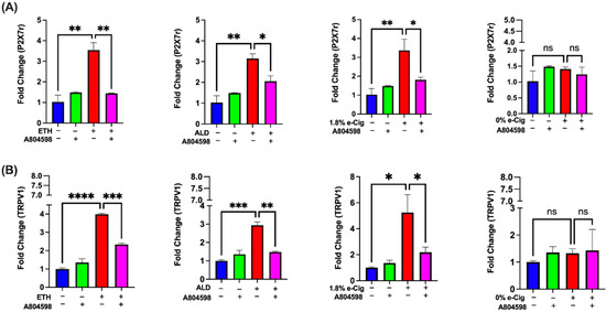 ETH, ALD, and 1.8% e-Cig exposure increased the gene expression of P2X7r and TRPV1 channels in hBMVECs. (A) hBMVECs treated with ETH, ALD, and 1.8% e-Cig exposure increased the P2X7r gene expression by four-fold while A804598 prevented such increases. (B) Simultaneously, expression of TRPV1 ion channel was also enhanced six-fold after exposure to ETH, ALD, or 1.8% e-Cig and A804598 treatment ameliorated the increases. q-PCR data were normalized with GAPDH (n = 3). One-way ANOVA was used for statistical analyses, marked as * p ≤ 0.05, ** p ≤ 0.01, *** p ≤ 0.001, **** p ≤ 0.0001 and ns (not significant).