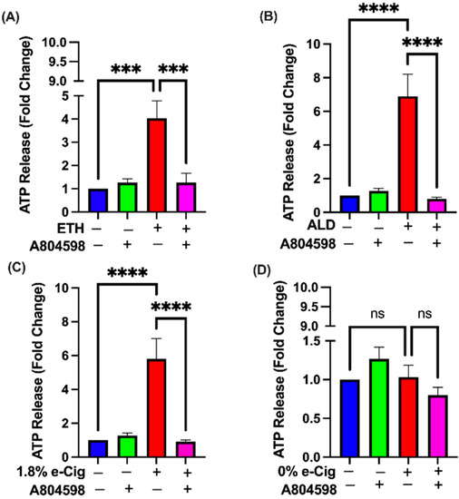 extracellular ATP release stimulated by ETH, ALD, and 1.8 % e-Cig exposure in hBMVECs and A804598 blocked the eATP release. hBMVECs exposed to (A) ETH presented a four-fold increase in eATP levels. Both (B) ALD and (C) 1.8% e-Cig demonstrated eight-fold increases in eATP, whereas (D) e-Cig with 0% nicotine showed no impact on eATP levels. Blockage of purinergic receptor (P2X7r) and TRPV1 ion channels by A804598 reduced the eATP levels (n = 3). One-way ANOVA was used for statistical data, where *** p ≤ 0.001, **** p ≤ 0.0001 and ns (non-significance).
