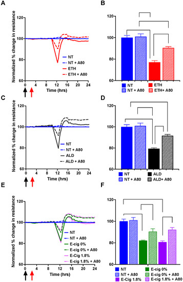 P2X7r inhibition protected barrier function. Trans-Endothelial Electrical Resistance (TEER) was measured continuously in hBMVECs with or without P2X7r inhibitor A804598 (at time 0 marked as black arrow) and exposed to ETH (A,B), ALD (C,D), or 1.8% e-Cig (E,F) (at 2 h marked as red arrow). After baseline TEER was achieved (between 6–7 days), the inhibitor and stimulators were added, and resistance was measured at 4000 Hz for the duration of the time shown. (A,C,E) are representative images from hBMVEC exposed to ETH, ALD, and 1.8% e-Cig respectively. (B,D,F) are average normalized percent change in TEER with positive SD (n = 3–5). Significance values from a two-way ANOVA analysis is shown in the graphs.