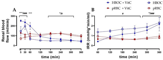 (A) Renal blood flow in the HBOC groups was initially higher than in the pRBC groups; however, it decreased and remained significantly lower between 180 min and 300 min perfusion. (B) Intrarenal resistance in the HBOC group was significantly higher than in the pRBC groups from 120 min onwards and in the HBOC + VitC group from 300 min (HBOC + VitC vs. pRBC + VitC; * p < 0.05, *** p < 0.001, HBOC vs. pRBC; # p < 0.05, ### p < 0.001).