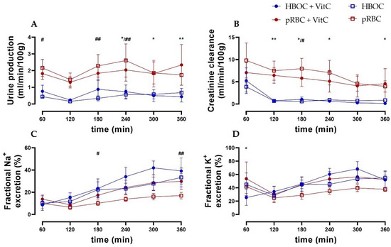 Urine production remained constant in all groups. However, it was higher in the pRBC groups compared to the HBOC groups with significant differences at 180 min and 240 min (pRBC vs. HBOC) and at 240, 300, and 360 min (pRBC + VitC vs. HBOC + VitC) (Figure 3A).