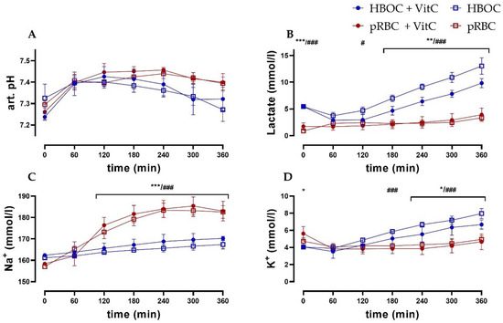 (A) Arterial pH, (B) lactate, and (C) perfusate sodium concentrations were significantly higher in the pRBC groups vs. the HBOC groups from 120 min onwards and (D) potassium concentrations remained significantly lower after 180 min (pRBC vs. HBOC; # p < 0.05, ### p < 0.001) and 240 min (pRBC + VitC vs. HBOC + VitC; * p < 0.05, ** p < 0.01, *** p < 0.001).