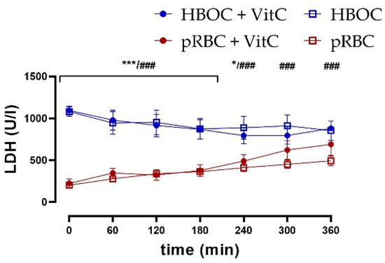 LDH perfusate concentrations were significantly higher in the HBOC groups than in pRBC groups without VitC throughout 6 h perfusion (HBOC vs. pRBC; ### p < 0.001) and until 240 min with VitC (HBOC + VitC vs. pRBC + VitC 0–180 min; *** p < 0.001, 240 min * p < 0.05).