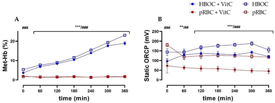 (A) Significantly higher levels of methemoglobin in the HBOC groups during 6 h perfusion without VitC and after 60 min with VitC. and (B) static oxidation reduction potential (ORCP) (HBOC + VitC vs. pRBC + VitC; ** p < 0.01, *** p < 0.001, HBOC vs. pRBC; ## p < 0.01, ### p < 0.001).