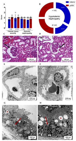 (A) Significant differences between the HBOC and the pRBC groups were not seen in the histological examination for tubular injury and osmotic nephropathy and (B) hypokalemic nephropathy. Signs of tubular damage and discreet dilation of the Bowman capsule (➔) were present in all four groups; examples of both HBOC- (C) and pRBC-group kidneys (D) are shown (hematoxylin–eosin stained, 20× magnified). In transmission electron microscopy, intact glomeruli (E,F) and proximal tubular cells with only scarce signs of damage (*: examples of vacuolization; ➔: intact mitochondria) could be detected in all four groups; examples of both HBOC (E,G, 4646× magnified) and pRBC group kidneys (F,H, 6000× magnified) are shown.