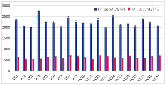 Content of total phenolics (TP) and total anthocyanins (TA) in fruits of 20 black mulberry (M. nigra) genotypes (VC1–VC20).