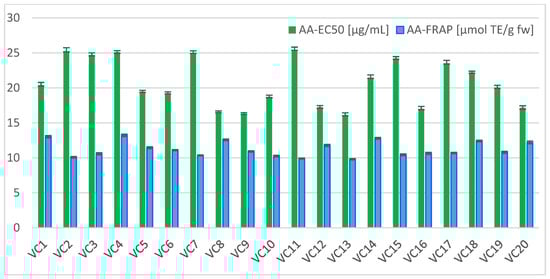 Antioxidant activity (AA) by DPPH (EC50) and FRAP assays in fruits of 20 black mulberry (M. nigra) genotypes (VC1–VC20).