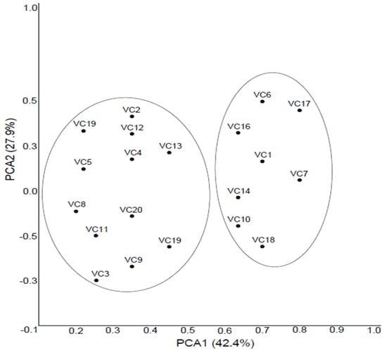 The grouping of each genotype was based on the proportion of total diversity. The contribution of the first three principal coordinates in the Principal Coordinate Analysis (PCoA) represented 80.5% of the variance. The components with the largest proportion of diversity were component 1 (PCA1) and component 2 (PCA2), which reached 70.3% (42.4% and 27.9%, respectively) of the overall variance; thus, the grouping was made based on these components. The third principal coordinate explained 10.2% of the overall variance. Black mulberry genotypes were, therefore, partitioned into two distinct groups: PCoA Group 1 included 12 samples and Group 2 included eight samples, respectively (Figure 3).