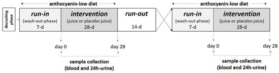Volunteers received the beverages, denoted as “one” or “two”, weekly at the Department of Nutritional Science. The beverages were filled in brown bottles to ensure blinding and distributed weekly to the volunteers by the lab personal. Participants were instructed to daily consume 0.33 L of the anthocyanin-rich juice or the anthocyanin-depleted placebo for 28 days. They were instructed to keep the juices cool and to avoid their exposure to direct light. Thus, after a 7-day wash-out period, a 28-day intervention period followed, and the first phase was completed by a 14-day run-out period. After the run-out phase, the next phase started with the next beverage (Figure 1).