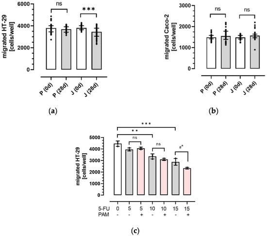 Migration of HT-29 and Caco-2 cells in vitro. HT-29 (a) and Caco-2 (b) cells were incubated with PAM from the anthocyanin-depleted placebo (P; n = 34) and anthocyanin-rich juice (J; n = 35) that were isolated before (0 d) and after 28-day (28 d) intervention. Migration was studied in a Boyden chamber with collagen-coated transwells. Basal cells in the lower chamber were measured after 36 h and migrated cell counts were detected fluorometrically as described in the Methods section. HT-29 cells (c) were exposed to indicated concentrations of 5-FU alone (5, 10, and 15 µM) and with pooled PAM (n = 10; most effective from (a)). Values are presented as aligned dot plots with median and interquartile range (25th–75th) (a,b) or means with standard deviation (c). Significant differences were calculated with a mixed model with multiple comparison test (Šídák’s) or ANOVA with multiple comparison test (Šídák’s). Values were different with ** p < 0.01 and *** p < 0.001 compared with the corresponding controls or with #* p < 0.05 compared with 5-FU (15 µM) alone. ns, non significant.