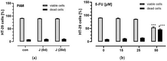 Effects of PAM (a) and 5-FU (b) on HT-29 cell viability. HT-29 cells were seeded at a density of 1 × 105 cells/mL in 24-well plates in complete medium with or without PAM from the anthocyanin-rich juice that were isolated before (J (0 d)) or after 28-day intervention (J (28 d)) or with medium alone (con), as well as with different concentrations of 5-FU. After 36 h incubation, cells were washed twice with PBS, trypsinized and cell viability was measured using a Guava® Muse® Cell Analyzer. Data are expressed as bars [%] with standard deviation. Significant differences were calculated with ANOVA with multiple comparison test. Values were different with *** p < 0.001 compared with viable cells of the controls (con) or with #*** p < 0.001 compared with dead cells of the controls (n = 2).