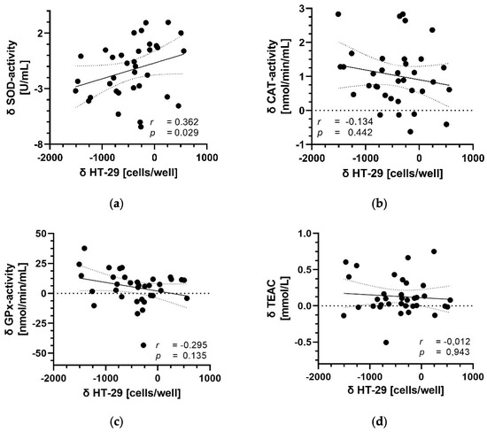 Scatter plots of antioxidant parameters and HT-29 migration. Correlation between HT-29 cell migration in vitro and SOD activity (a), CAT activity (b), GPx activity (c), and TEAC (d) in plasma. Correlation between the parameters were evaluated using Spearman correlation (r) with differences (δ) between values from day 28 and day 0 after anthocyanin-rich juice intake (n = 35).