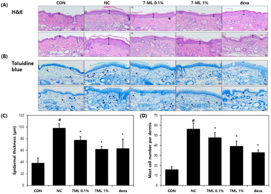 Effects of 7-ML on epidermal thickness and mast cell numbers in the DNCB-induced mouse model. Dorsal skin sections were harvested and stained with H&E (A) or toluidine blue (B) to evaluate epidermal thicknesses (C) and mast cell numbers (D). Black up–down arrow indicates epidermis. Black arrow head indicates mast cell. The results are expressed as means ± SDs (n = 3). # p < 0.05 vs. nontreated controls; * p < 0.05 vs. DNCB negative controls. CON, nontreated control; NC, DNCB-treated negative control; 0.1% or 1% 7-ML, DNCB + 0.1% or 1% 7-ML-treated groups; dexa, DNCB + dexamethasone-treated group.