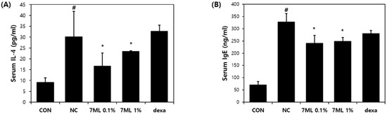 Effects of 7-ML on serum IL-4 and IgE levels in DNCB-induced mice. Serum IL-4 (A) and IgE (B) levels were measured using an ELISA kit. The results are expressed as means ± SDs (n = 3). # p < 0.05 vs. nontreated controls; * p < 0.05 vs. DNCB negative controls. CON, nontreated control; NC, DNCB-treated negative control; 0.1% or 1% 7-ML, DNCB + 0.1% or 1% 7-ML-treated groups; dexa, DNCB + dexamethasone-treated group.
