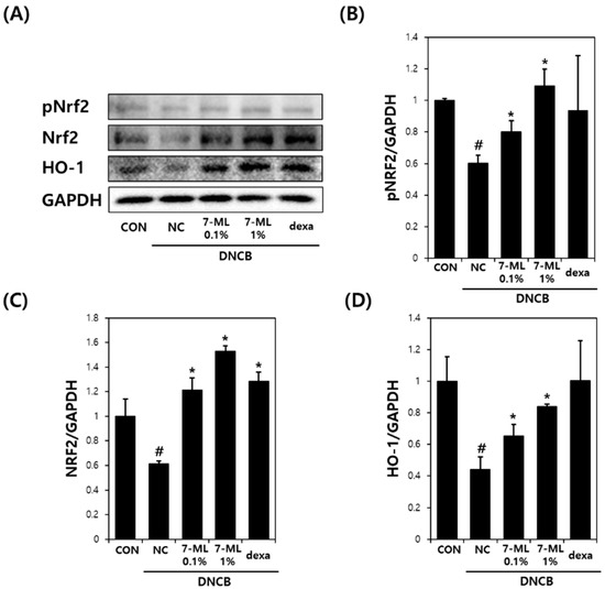 Effects of 7-ML on Nrf2/HO-1 pathway activation in a DNCB-induced mouse model. pNrf2, Nrf2, and HO-1 protein levels in mouse skin tissues were measured by Western blotting (A). pNrf2, Nrf2, and HO-1 levels were normalized versus GAPDH (B–D). Results are expressed as means ± SEMs (n = 3). # p < 0.05 vs. nontreated controls; * p < 0.05 vs. DNCB controls. CON, nontreated control; NC, DNCB-treated negative control; 0.1% or 1% 7-ML, DNCB + 0.1% or 1% 7-ML-treated groups; dexa, DNCB + dexamethasone-treated group.