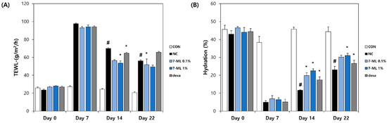 Effects of 7-ML on skin barrier function in a DNCB-induced mouse model. The level of TEWL (A) and the level of skin hydration (B) were measured using a Tewameter TM210 and Skin-O-Mat for 3 weeks. The results are expressed as a mean ± SD (n = 3). # p < 0.05 vs. nontreated control; * p < 0.05 vs. the DNCB-treated negative control. CON, nontreated control; NC, DNCB-treated negative control; 0.1% or 1% 7-ML, DNCB + 0.1% or 1% 7-ML-treated groups; dexa, DNCB + dexamethasone-treated group.