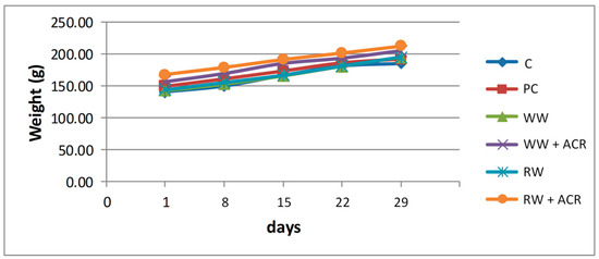 At the end of the 4 experimental weeks, the final body weight differed significantly only for rats in the RW + ACR group, not for those in the WW + ACR group, when compared to the PC group. No significant differences were observed in terms of weight gain in the animals in the WW + ACR group and the RW + ACR group, respectively, when compared to the PC group, nor in the animals in the WW group and the RW group, respectively, when compared to the control group.