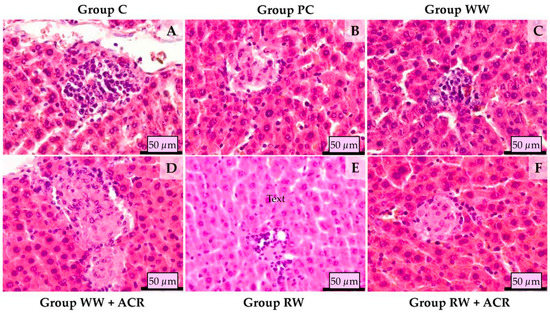 At the end of the experimental period, the relative liver weight of rats in the PC group was significantly higher (p < 0.05) than that of the rats in the C group. Also, the relative liver weight was significantly increased (p < 0.05) in the WW + ACR group compared to the C group. In contrast, red wine supplementation in the RW + ACR group prevented a significant increase in the relative liver weight of rats compared to the C group. No significant differences in relative liver weight were obtained between the WW + ACR and RW + ACR groups, respectively, and the PC group.