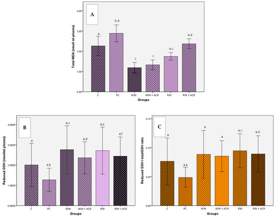 Effects of white/red wine on: total MDA plasma level (nmol/mL) (A), reduced GSH plasma level (nmol/mL) (B), and the reduced GSH/total GSH ratio (C) in rats from ACR-treated groups compared to untreated ones (n = 10). Bars marked with the same letter do not differ significantly (p < 0.05). C−hydroalcoholic solution group; PC−hydroalcoholic solution + acrylamide group; WW−white wine group; WW + ACR−white wine + acrylamide group; RW−red wine group; RW + ACR−red wine + acrylamide group.