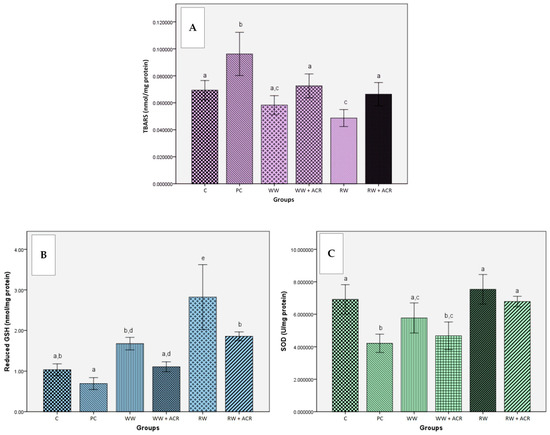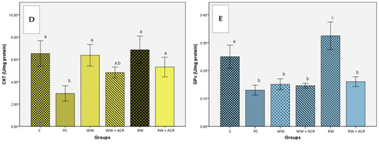 Effects of white/red wine on hepatic TBARS level (nmol/mg protein) (A) and reduced GSH hepatic level (nmol/mg protein) (B) in rats from ACR-treated groups compared to untreated ones (n = 10). Effects of white/red wine on superoxide dismutase activity (U/mg protein) (C), catalase activity (U/mg protein) (D), and glutathione peroxidase activity (U/mg protein) (E) in liver tissue of rats from ACR-treated groups compared to untreated ones (n = 10). Bars marked with the same letter do not differ significantly (p < 0.05). C−hydroalcoholic solution group; PC−hydroalcoholic solution + acrylamide group; WW−white wine group; WW + ACR−white wine + acrylamide group; RW−red wine group; RW + ACR−red wine + acrylamide group.